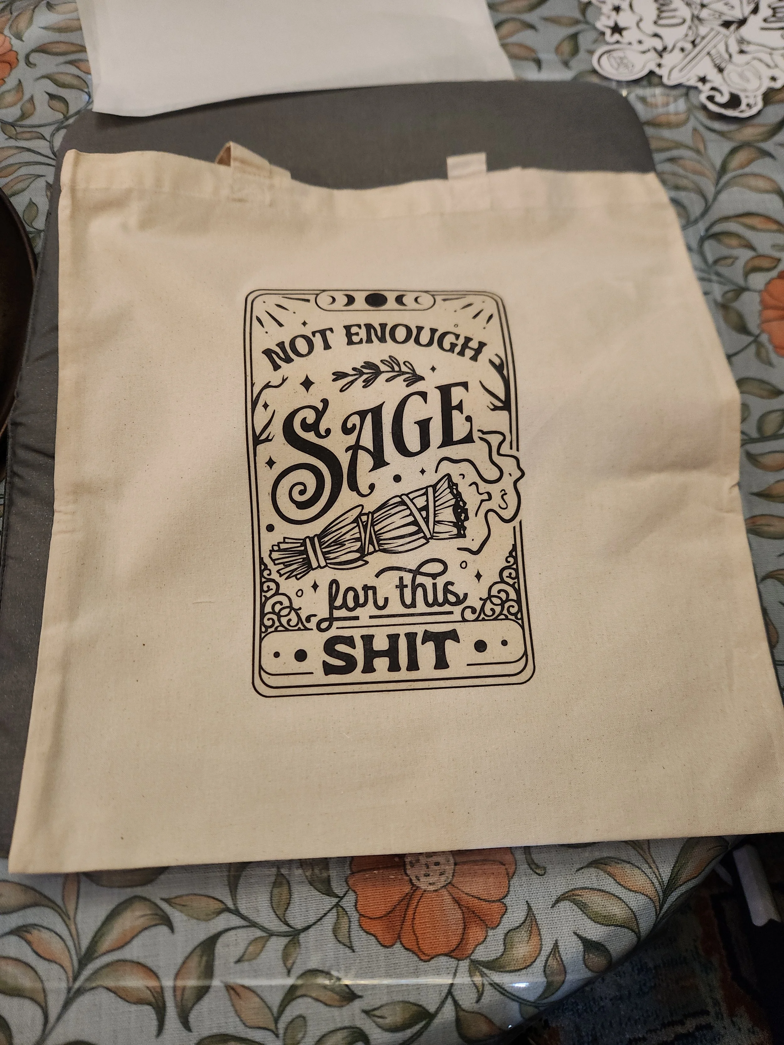 Shop › Not Enough Sage Tote Bag Image 1 of 1 Not Enough Sage Tote Bag $12.00 100% Cotton tote bags Quantity: Add To Cart Added! 100% Cotton tote bags